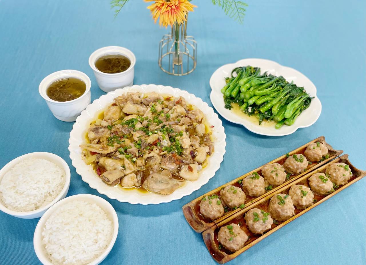 特色竹筒肉丸、蒜蓉时蔬、龙门丝苗饭