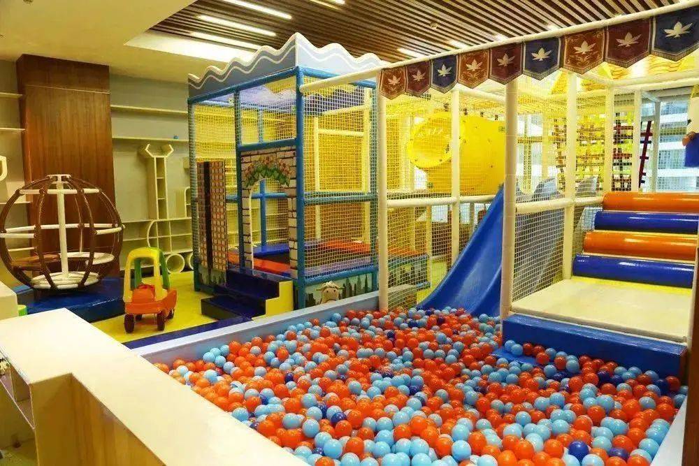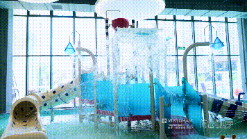 室内儿童戏水区有小冲天、儿童滑道...