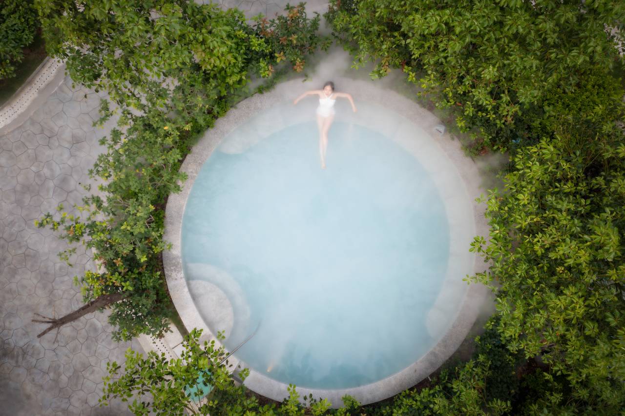 依云岛架空层东侧室外温泉包含4个原汤温泉泡池、