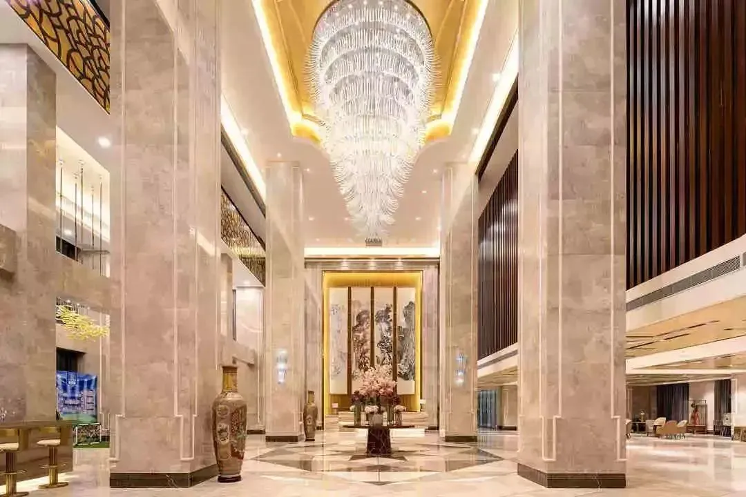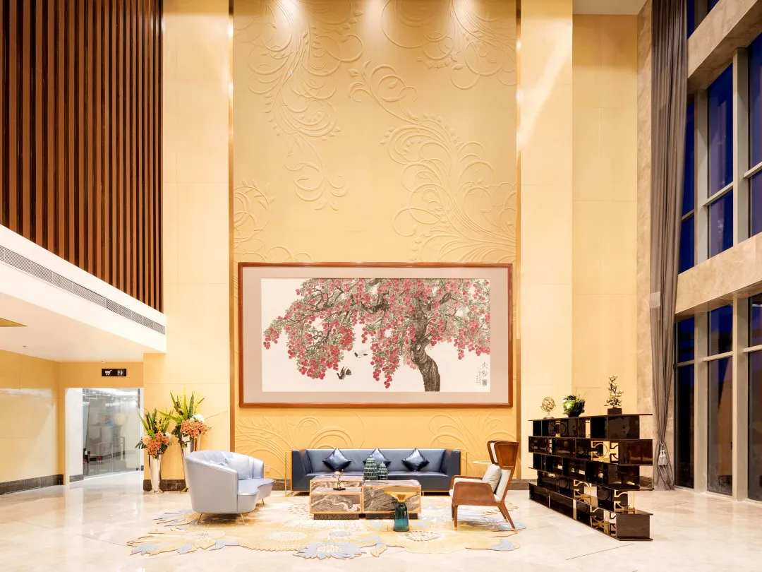 酒店大堂采用绿植布景、大理石造景、水墨画饰景。