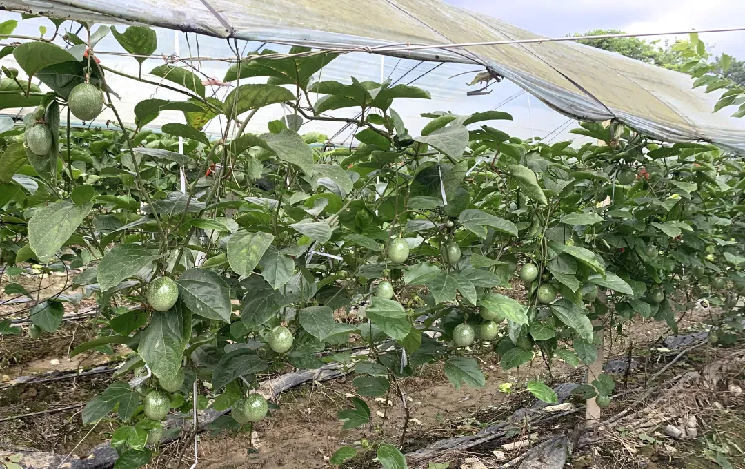 走进百香果种植区,只见绿油油的藤蔓爬满棚架,