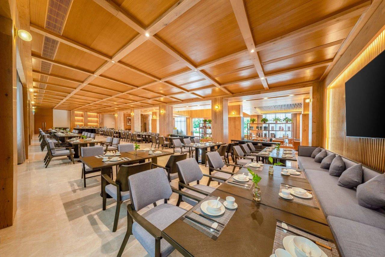 度假村景区综合商业中心,即度假村主要用餐区域。综合商业中心共四层,一楼是自助餐厅,二楼是宴会厅和包厢,主要有5个包厢,4个小包厢,1个可容纳20人就餐的大包厢。