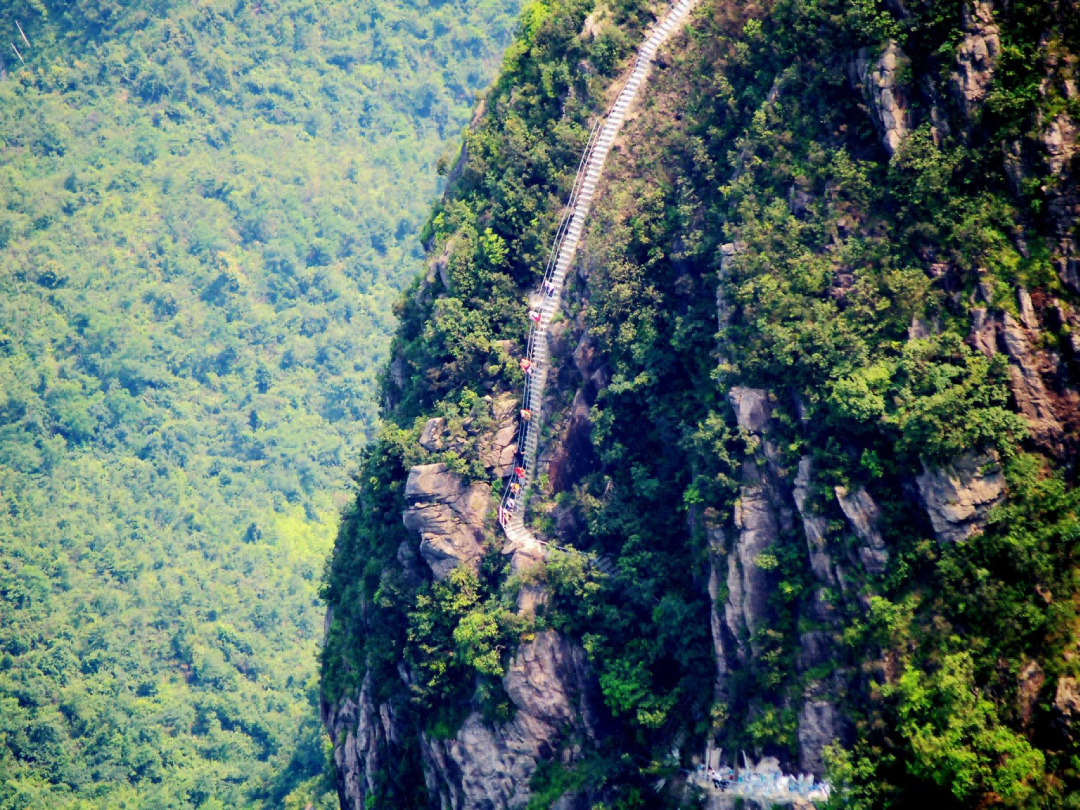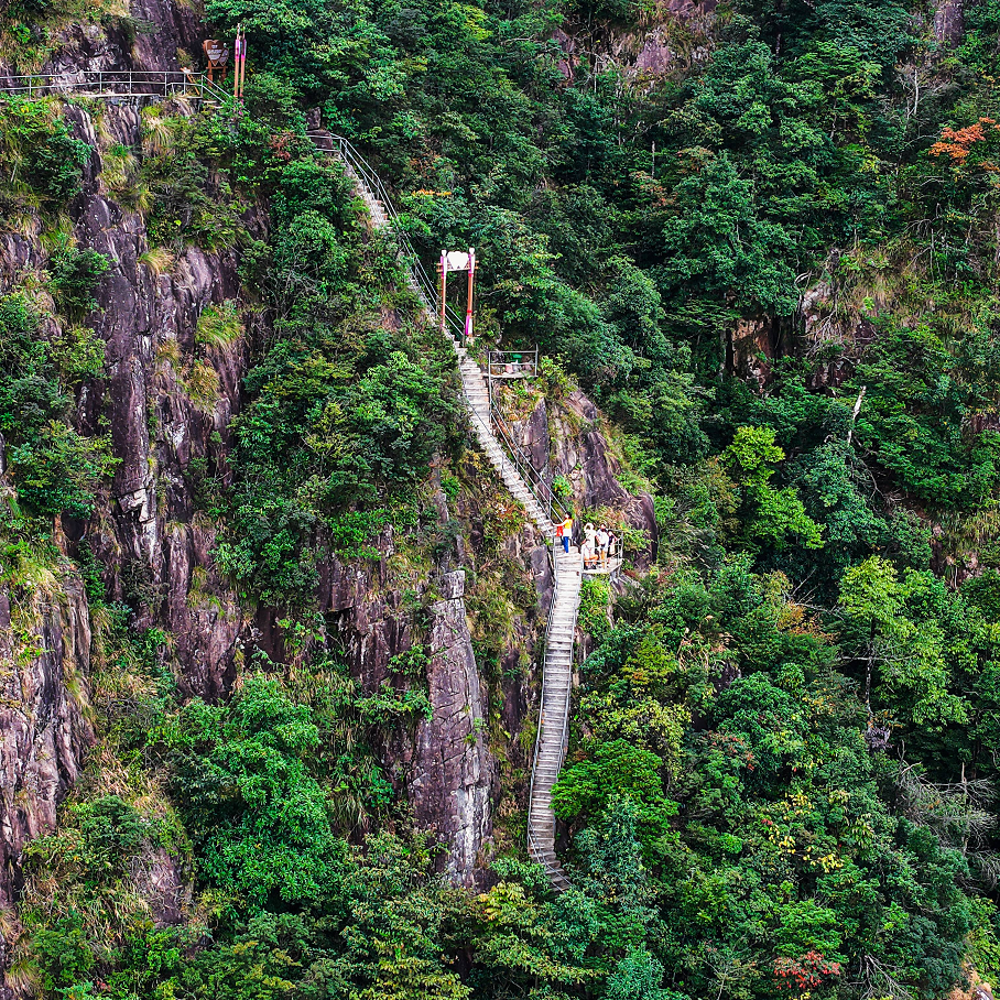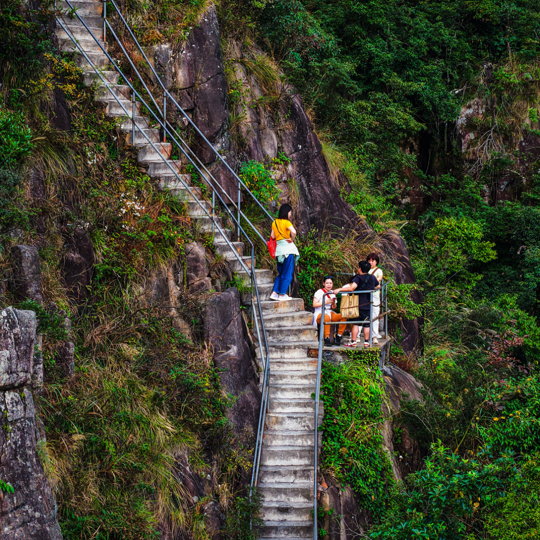 金子山的绝壁爱情天梯以其接近垂直的坡度和2000多级台阶,为登山者提供了一项极限挑战。这条天梯长500多米,坡度达到80度,几乎是垂直攀登,考验着游客的勇气和体力。攀登过程中,游客可以体验到征服自然的喜悦,同时也能够享受到沿途的壮丽山景。