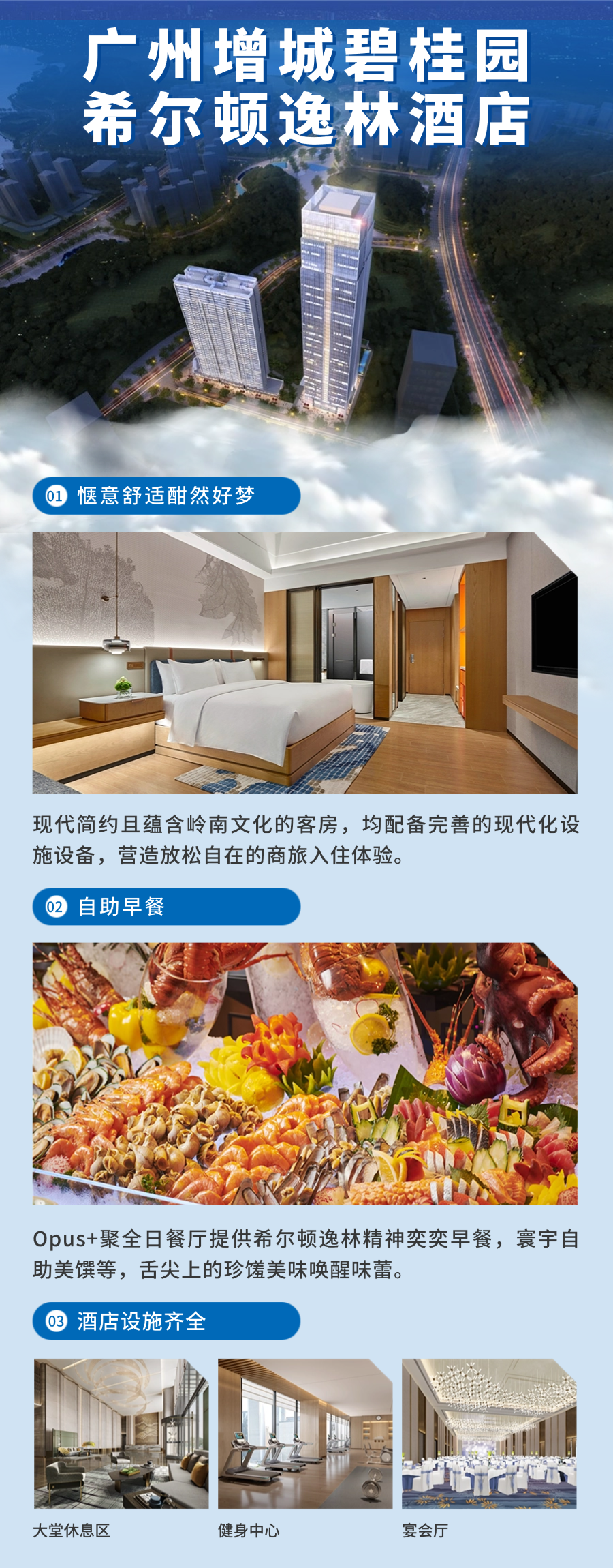 广州增城碧桂园希尔顿逸林酒店坐落于增城中央商务区核心地带,位于碧桂园中心,毗邻增城万达广场,步行约5分钟即可达到广州地铁21号线增城广场站,距离新塘南高铁站仅约38分钟车程,宾客可便利前往广州各区以及大湾区核心城市。