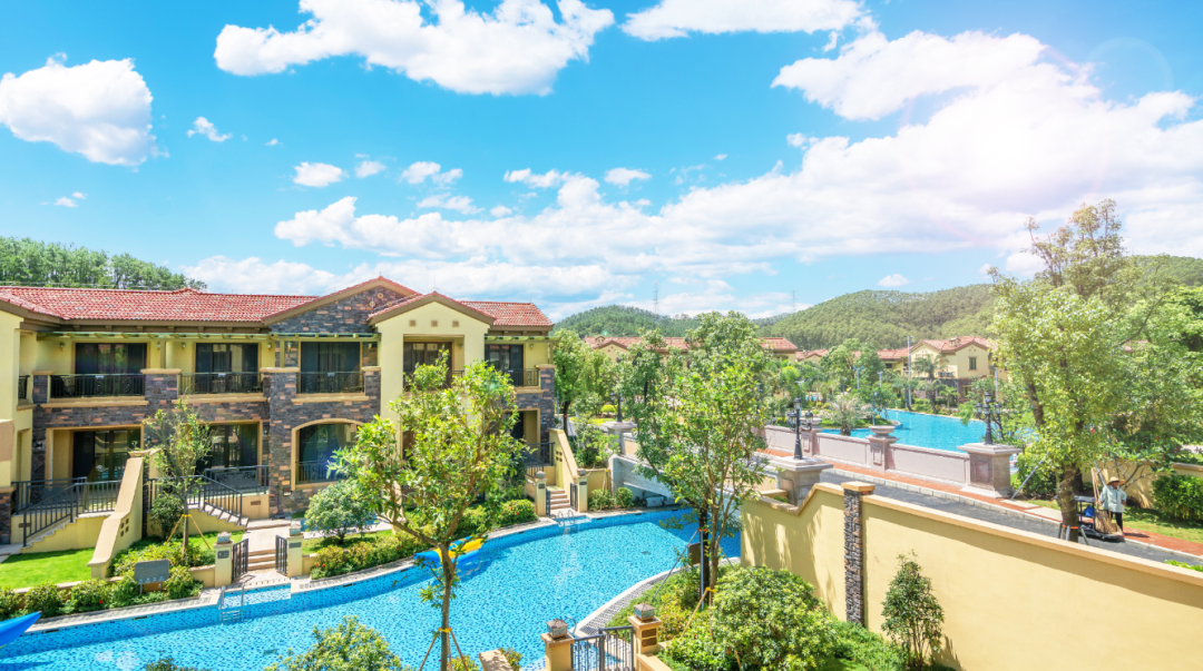 岸边花草树木相伴,度假区虫鸣鸟叫
