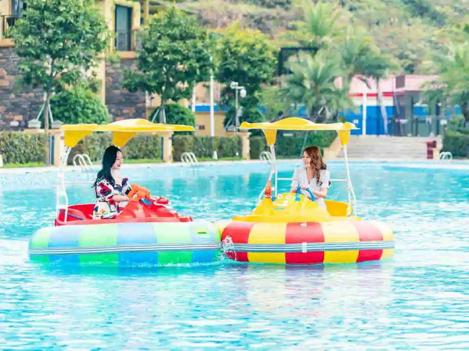 水中有各种火烈鸟、玻璃船等网红玩水道具
