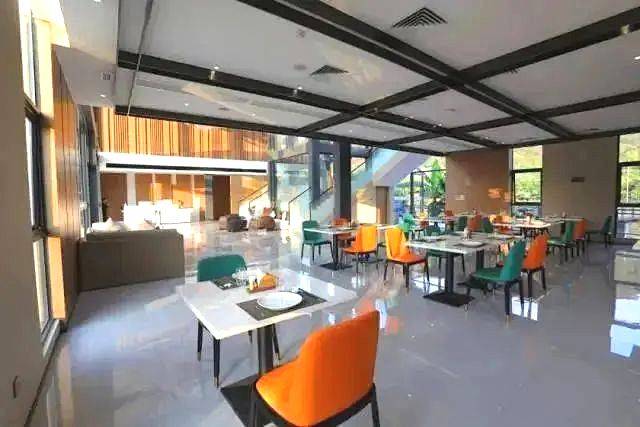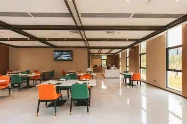 餐厅设计配色延续了灰色和金色,但在软装上使用孔雀绿、深橘棕,布艺材质更加复古典雅。餐厅提供了多样化的餐饮选择和优质的服务,是旅游或出差用餐的不二选择