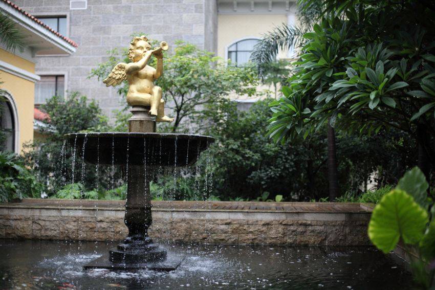 中心岛四周分布有喷水雕塑、瀑布、神秘水帘洞、