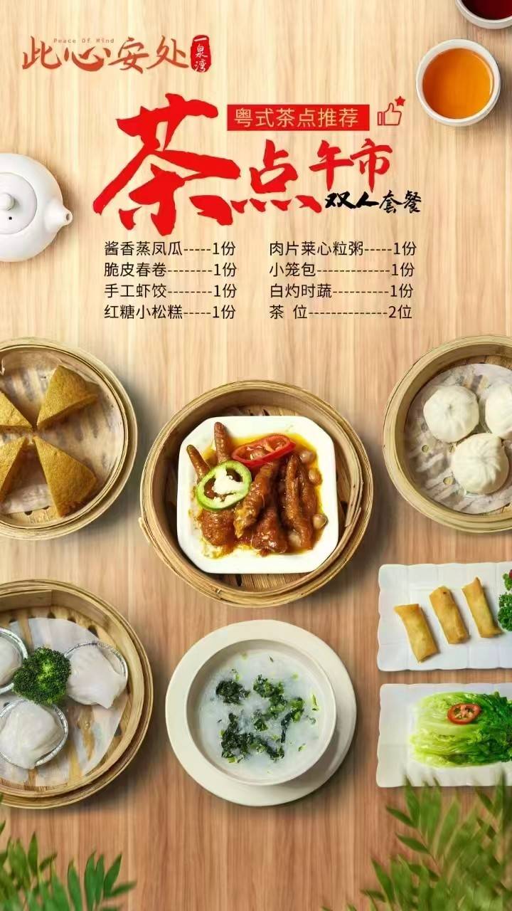 8、套餐赠送豪华广式茶点午餐,入住次日享用,用餐地址,壹泉湾酒店餐厅,菜单如下,仅供参考: