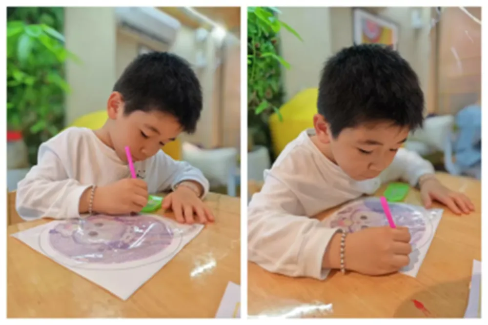 酒店亲子中心设置趣味贴画专区,客人可凭套餐票领取贴画底图一份,客人通过粘、贴的简单动作,根据底图作画指示,即可完成一幅色彩斑斓的贴画,完成的作品可自由带走。