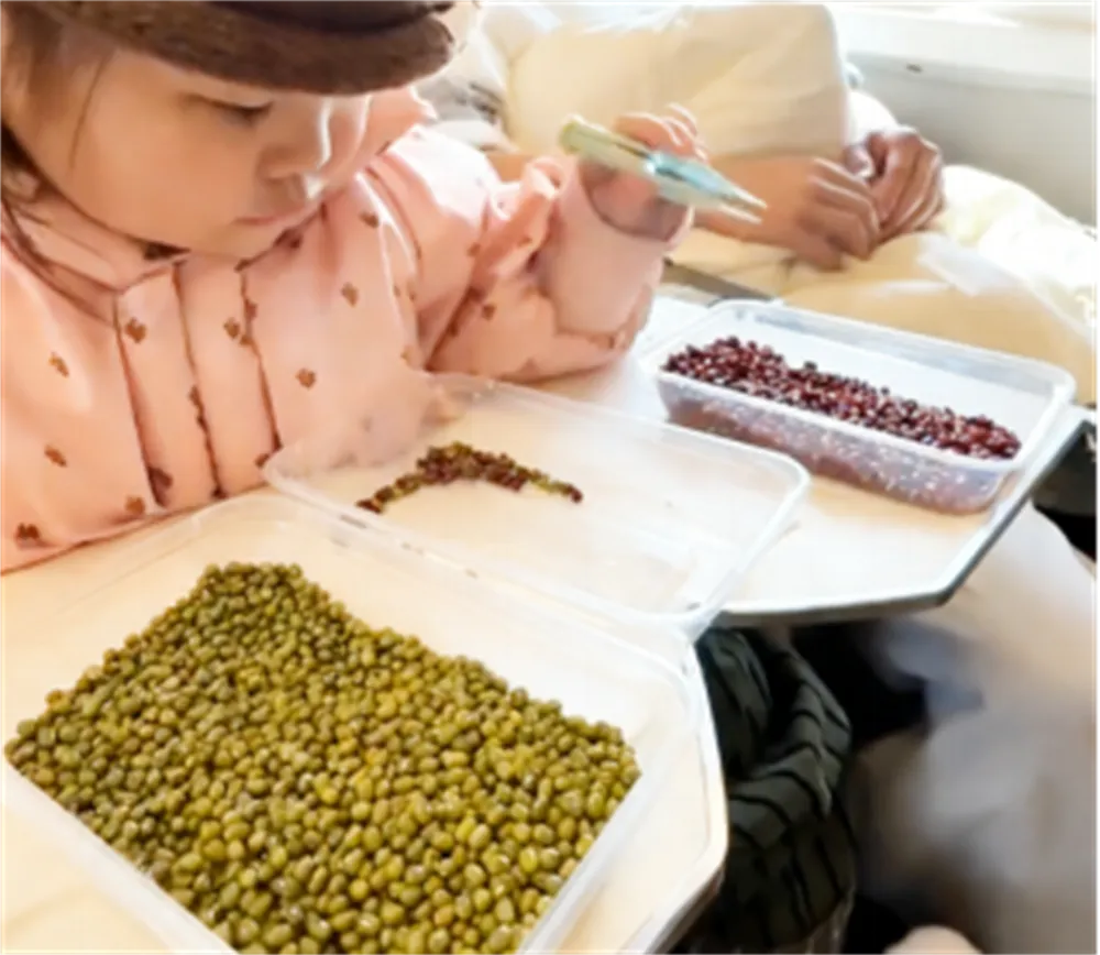 在指定工作台设置豆豆挑战碗,碗中混合红豆、绿豆。孩子们在规定时间内,使用小工具(如镊子、筷子)或手将所有绿豆和红豆分别挑出到另外两个碗,即为挑战成功,可获得一只哪吒电影主题小手办。