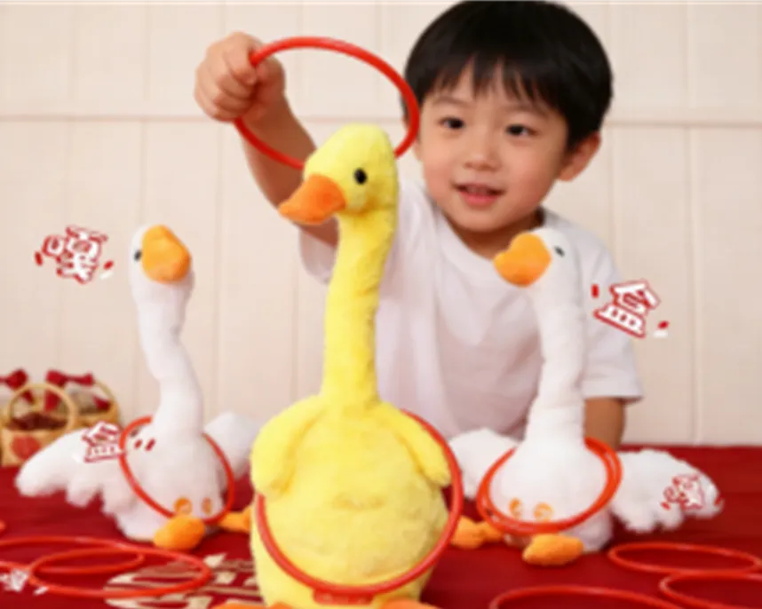 在亲子中心划定区域,放置一只玩具小黄鸭。家庭可在亲子中心领取一定数量的套圈,站在指定线外进行套取。家庭成员可自由进行套圈游戏。