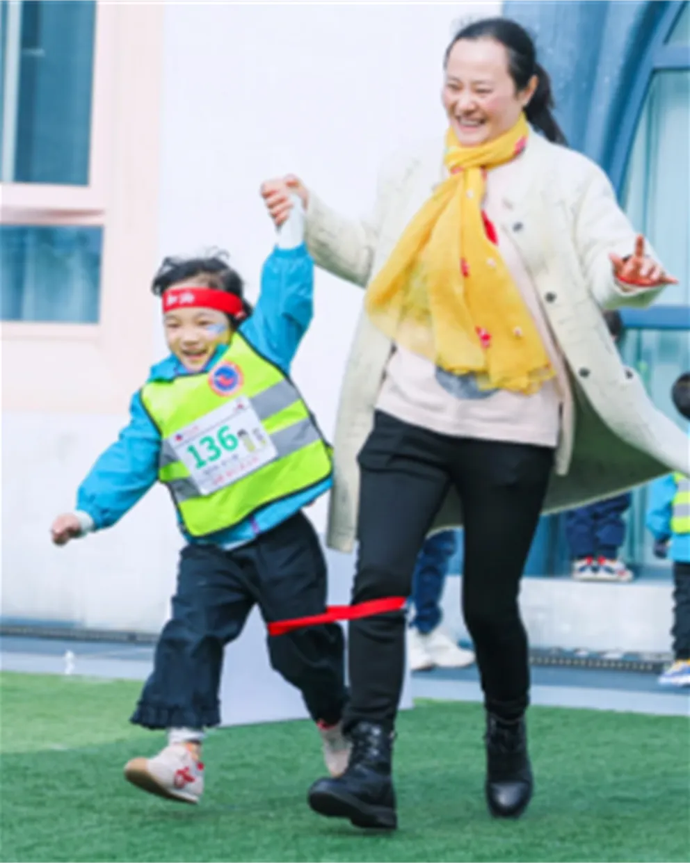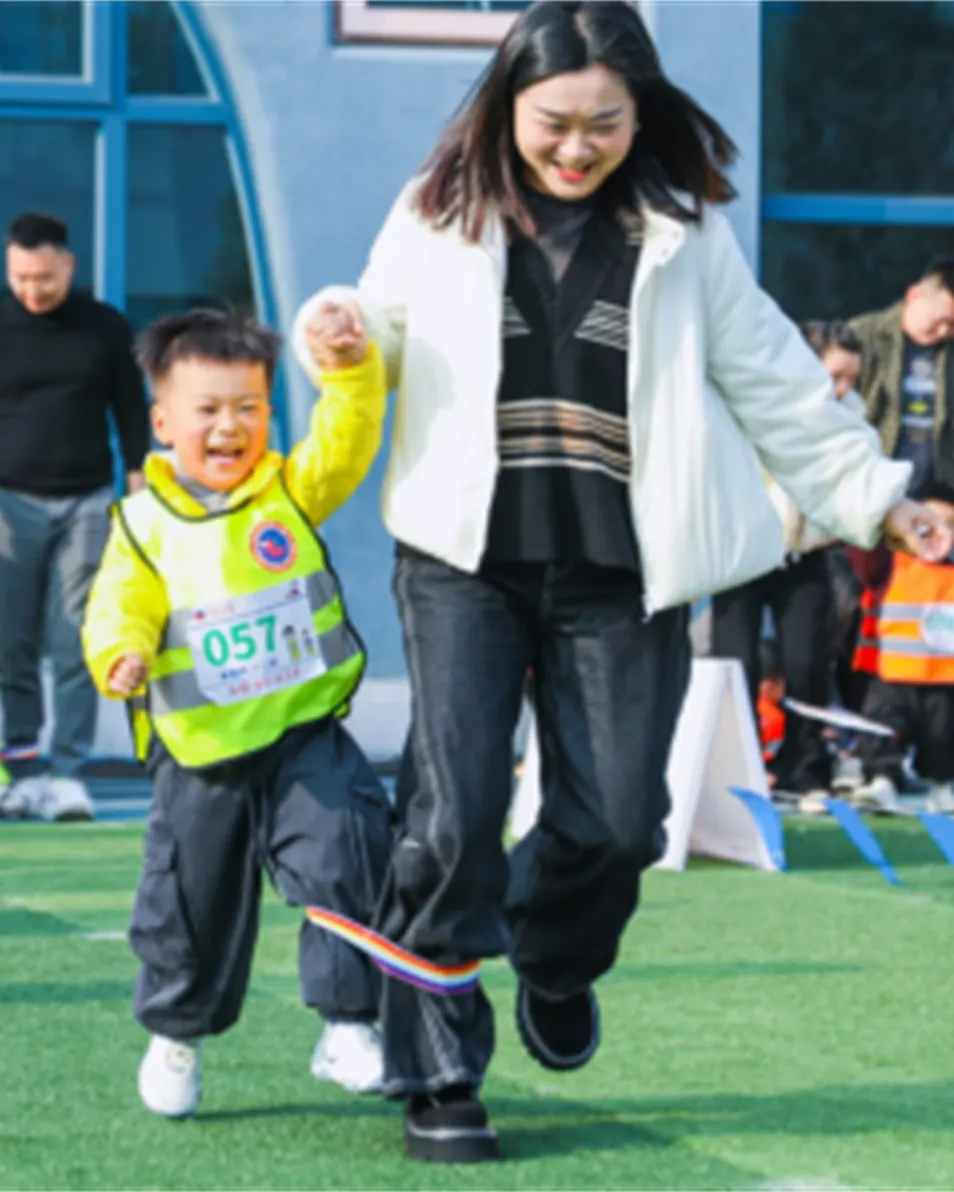 在亲子中心/户外草坪设置短程赛道。使用束脚带将家长与孩子相邻的脚绑在一起,组成“二人三足”组合,做出最快抵达终点速度,记录家庭最佳成绩,也可进行家庭之间比拼。