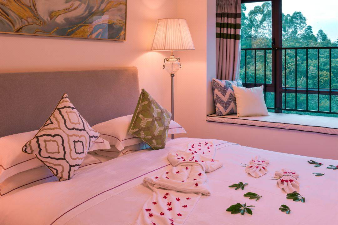 7、度假区分副楼区、主楼区、别墅区、游乐区、温泉区等区域,此套餐入住的副楼区距离游乐区、温泉区等配套设施约1km,度假区提供免费观光车接送服务(提供接送时间为 7:30-23:30)