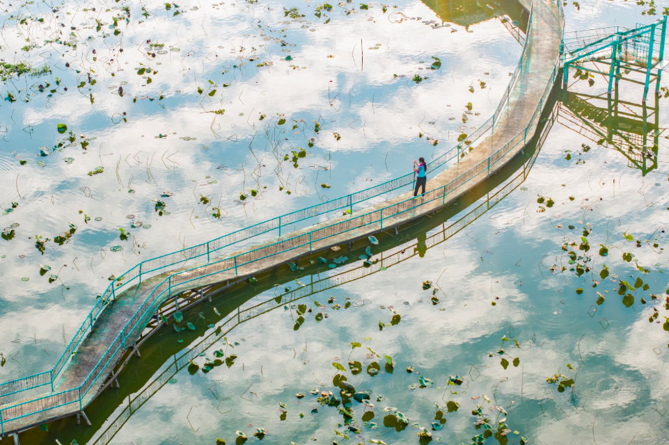 沿着湖畔步道漫步,四季的风景轮番上演。