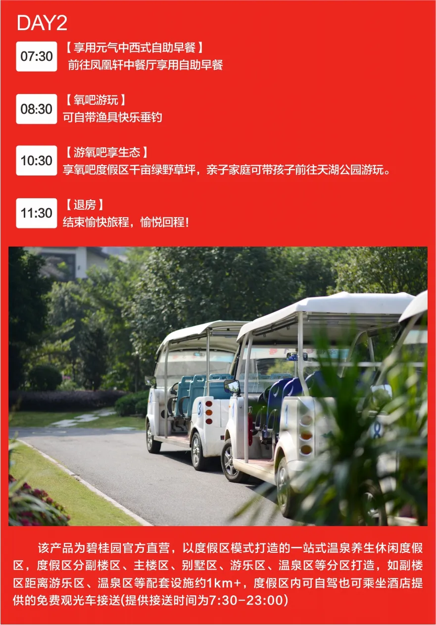 2.该产品为碧桂园官方直营,以度假区模式打造的一站式温泉养生休闲度假区,度假区分副楼区、主楼区、别墅区、游乐区、温泉区等区域,入住的副楼区距离游乐区、温泉区等配套设施约 1km+,度假区提供免费观光车接送服务(提供接送时间为7:30-23:30) 。