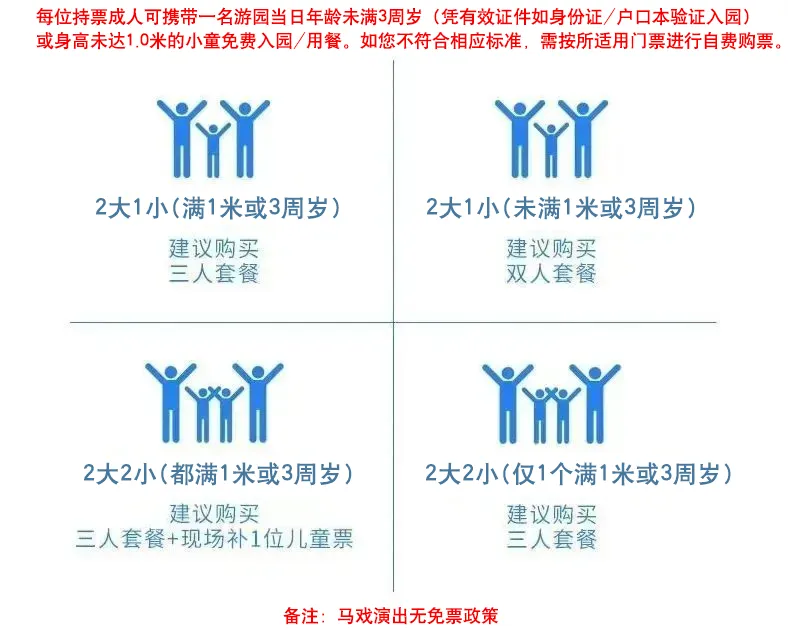 *大马戏无论大小,均需购票入场!如2大1小(未满1米)可预约双人套餐,酒店前台补一张马戏儿童票即可。