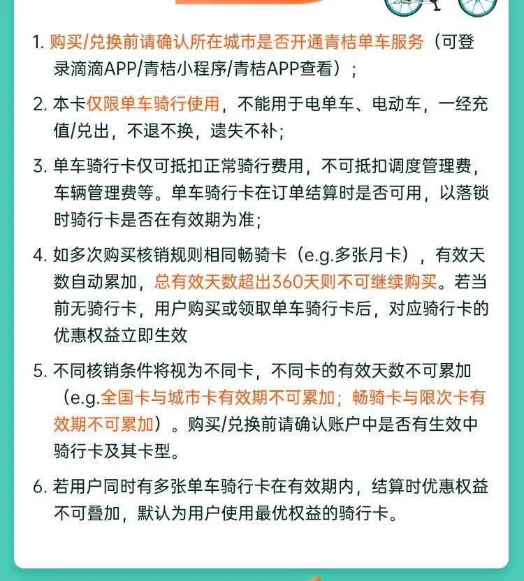 3.购买前请确认所在城市是否开通青桔单车服务(可登陆青桔APP/青桔小程序查看),并确认是否在可用区域内;